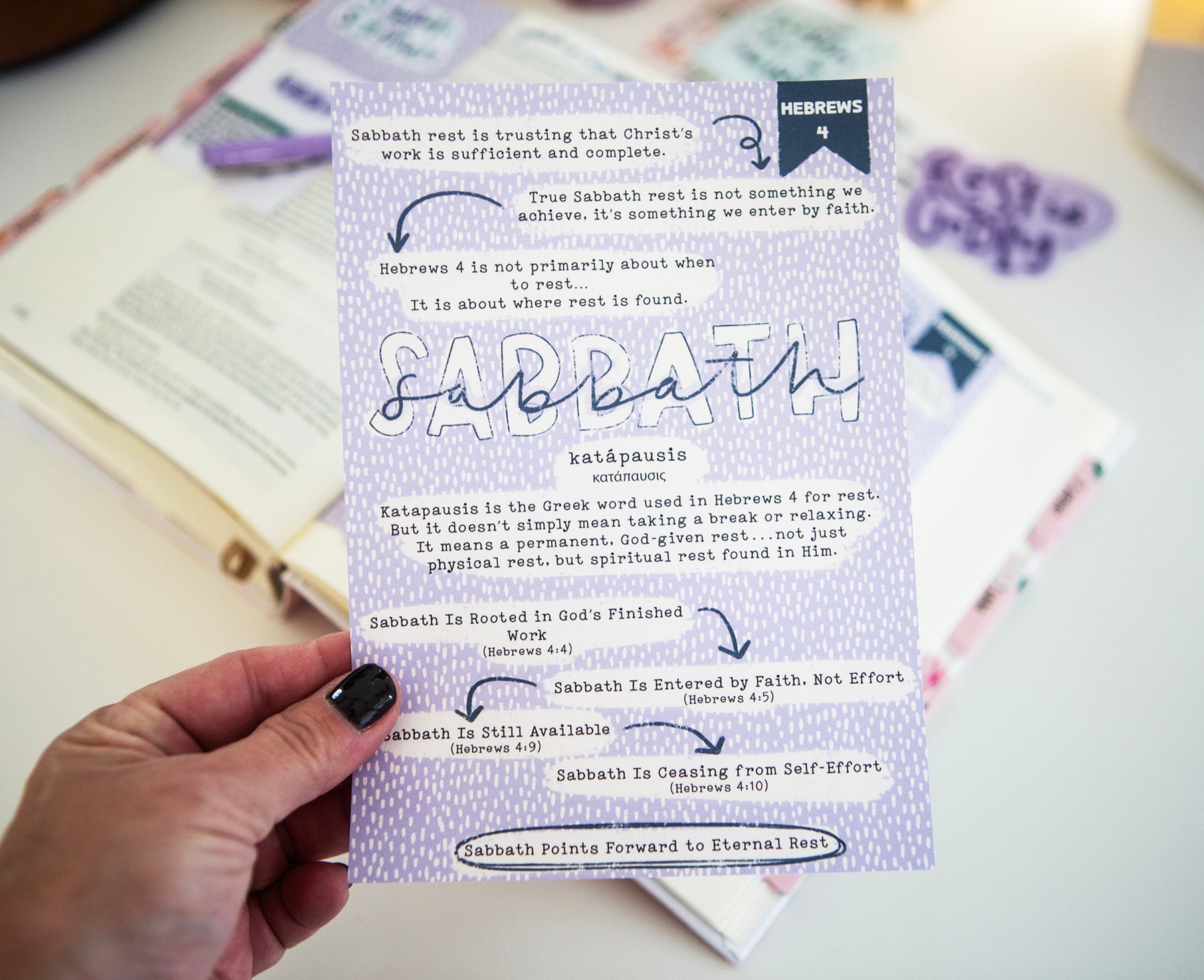 Each tip-in is professionally printed on high-quality paper, sized at 5"x7" to fit in your Bible or journal. Designed to coordinate with the Sabbath Through Scripture theme, easily add this to your Bible with glue or washi tape to help you engage more deeply with the Word.