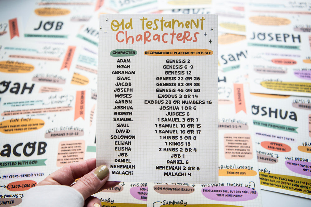 The Loaded Bible Old Testament Characters Tip-In Set is a digital download designed to help you dive deeper into the stories and people of the Bible. This printable bundle includes 20 unique tip-in sheets, each highlighting a key Old Testament figure - from Adam and Noah to David, Daniel, and Malachi.